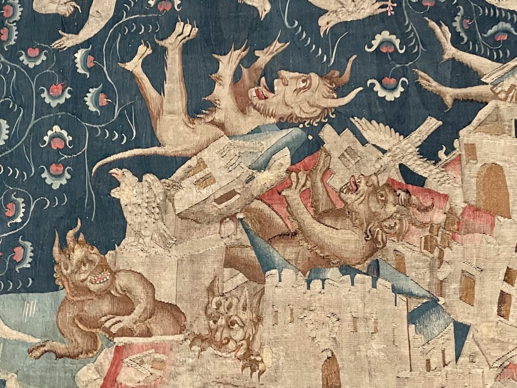 Pour commencer nous traversâmes la galerie des tapisseries de l’Apocalypse qu’on put apercevoir en vitesse, avant d’accéder, par une porte dérobée à la chapelle Saint Laud (ou ce qu’il en reste). Elle date des Plantagenêt. Eh oui, j’avais oublié qu’au XIIème siècle Angers était le centre de l’Empire Plantagenêt (les anglais l’appellent « Angevin Empire »), qui allait de l’Ecosse aux Pyrénées, sous la houlette de Henri II, roi d’Angleterre, duc de Normandie, Comte d’Anjou, Comte de Poitou et duc d’Aquitaine.